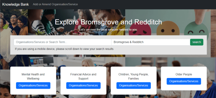 KnowledgeBank is a useful directory of services and organisations across Bromsgrove and Redditch that can offer a range of support. (BARN helps maintain the voluntary and community sector listings.)