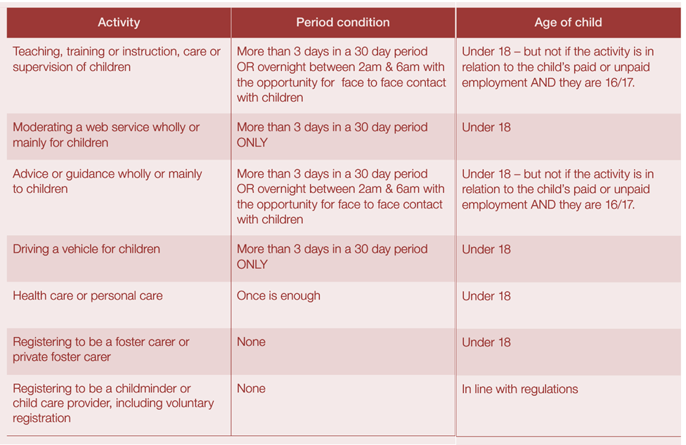 Not everyone can have a DBS check. To apply for a DBS you must be taking part in a regulated activity. These are defined below. The exception to these is for trustees of children’s charities and charities that carry out regulated activity for both children and adults, where DBS checks are requested by the Charity Commission: